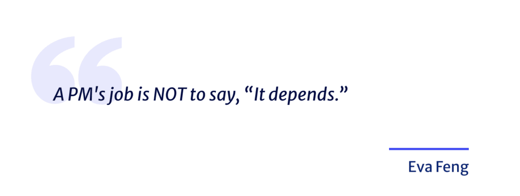 Another common pitfall is that some PMs are pretty diplomatic. They will say “Oh, it depends.” PMs need to be able to frame the important decisions facing the business into a programmatic choice or plan of action. A PM’s job is not to say “It depends.”