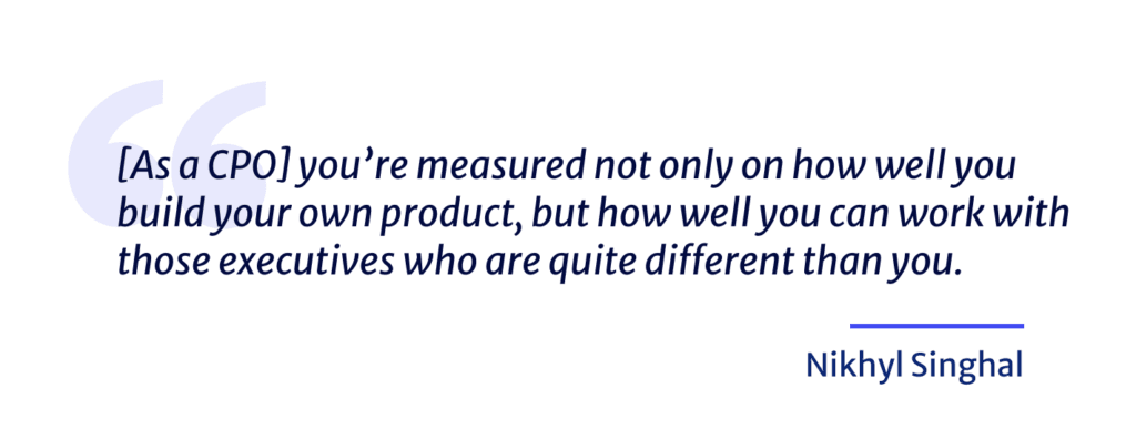 And lastly, the most interesting part of about being a CPO is that your peers are not product folks. They’re actually other C-level executives like the person that leads sales, marketing, HR, finance or legal. That partnership means that they are not at all brought up in your same value system and perhaps the same expertise and background. They may not even be from tech. They may be completely different types of leaders and mindsets and their teams are going to be run very differently.
