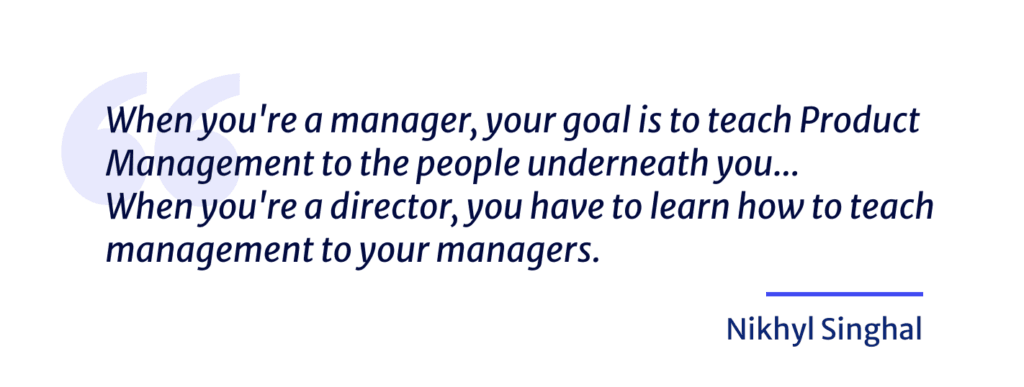 When you’re a director, you have to have a mindset shift of not just teaching Product Management to your ICs, but you have to learn how to teach management to your managers. And often the skill is radically different. And again, it has a little bit to do with letting go and gripping the steering wheel at just the right level of strength so that the manager can continue to keep it in motion under some guidance.