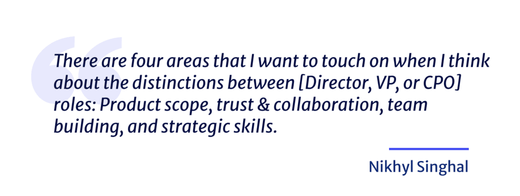 So when I refer to Director, VP, or CPO, I’m really heading towards the later stage companies. And that way we can compare and you can do your own translation as we go through this. There are four areas that I want to touch on when I think about the distinctions between these roles: Product scope, trust & collaboration, team building, and strategic skills. All Product Managers end up having to think through these areas, but I pulled these four out because they’re just so different and they beg different skills to come from the candidates.