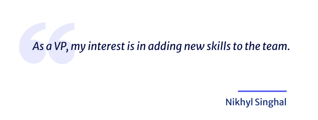 As a VP, for the first time you’re spending as much time talking to other leaders and other products as you are with your own team. So it’s a pretty distinct point of focus, where you say: I not only need to make sure that the product below me is working, but I have to make sure the other teams are actually understanding what we’re doing.Oftentimes I’m working with those other teams as much as much as my own team. And I’m measured on my ability to peer with another person who’s at my level.