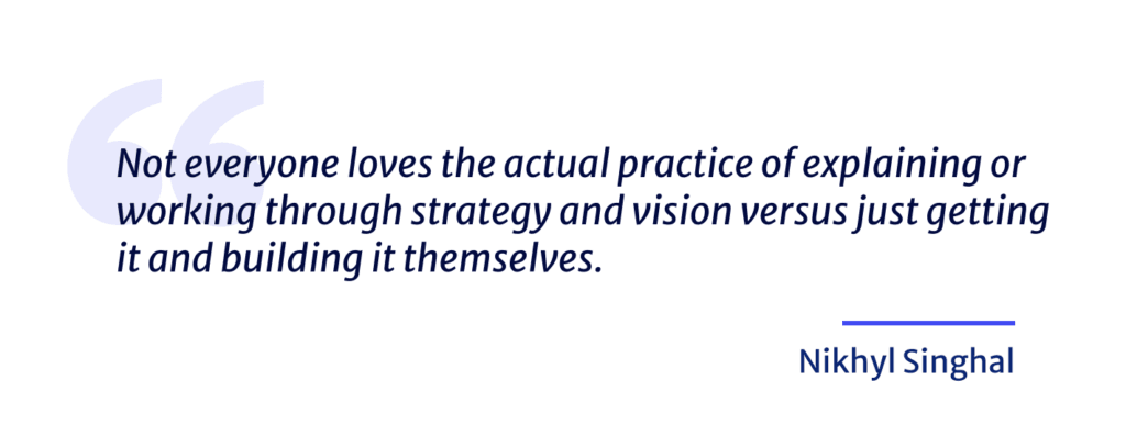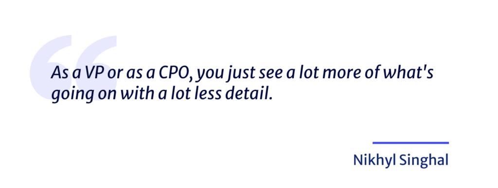 Now what you end up realizing is that as a VP or as a CPO, you just see a lot more of what’s going on with a lot less detail. And so the skill to master is: How do you achieve this breadth by sacrificing depth? Where people struggle is that they don’t have the skill to let go and sort of make decisions with less information. And when you’re in that stage, you end up finding yourself working harder and harder and harder. So where you end up burning out is at that Director and VP level where you just literally cannot continue to go forward because you don’t know how to give up and use, say, 20% of the information to make 100% of a decision.