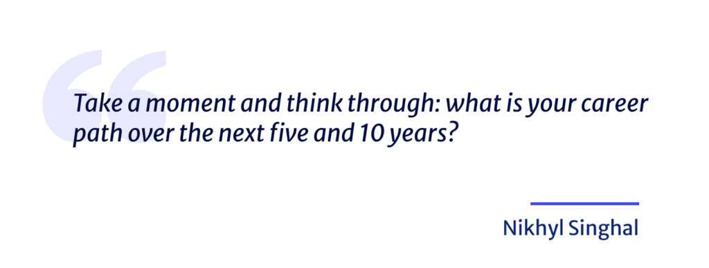 We get oftentimes so focused on what’s next, what does promotion look like, what’s the right level, am I at the right company? But if you think through five years or 10 years from now and then think about, are the steps and changes that I’m making in the next few years leading me to that destination? That’s really a career plan, and you want your next step to fit into that sort of long-term plan.